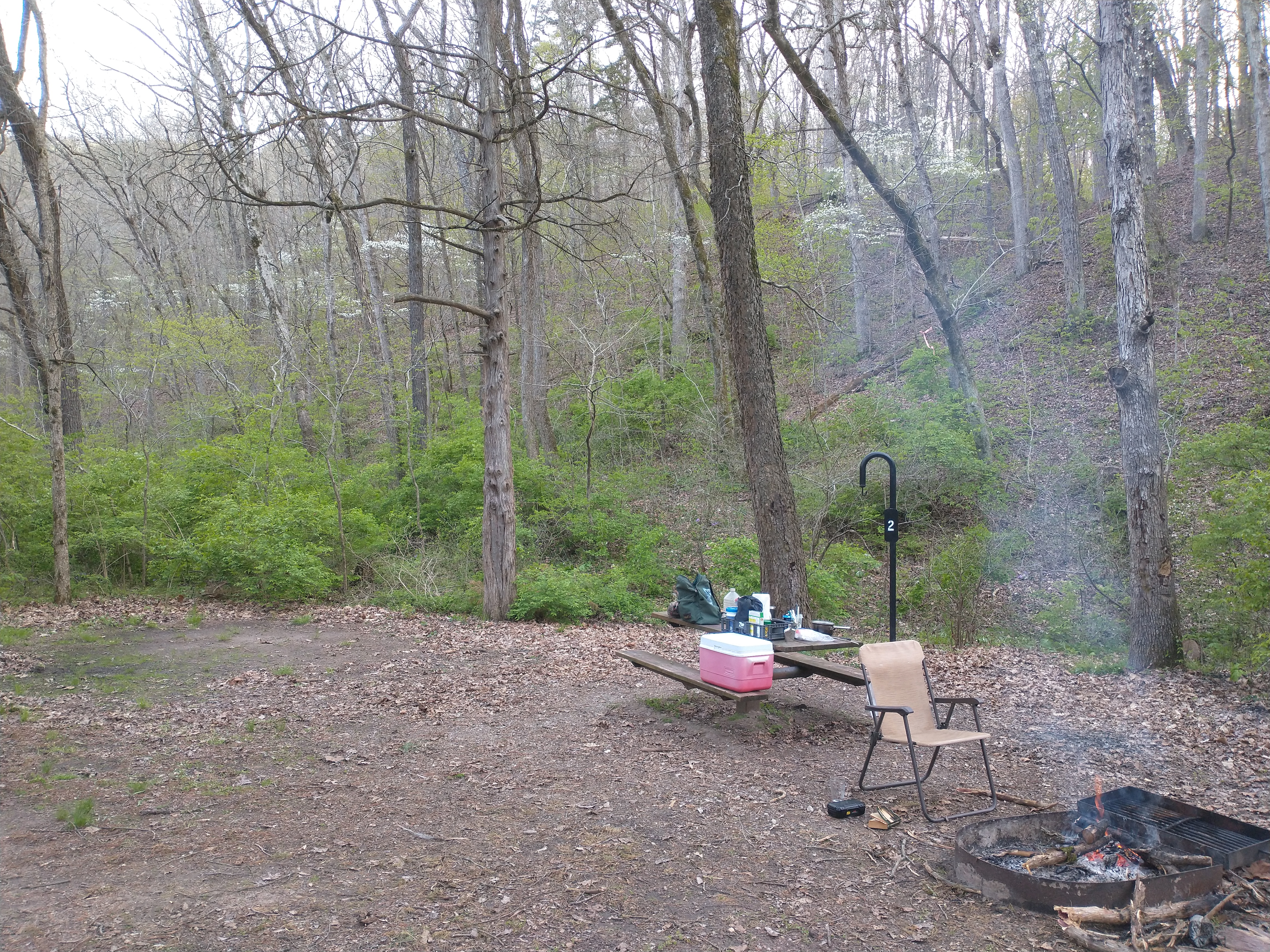 Coming back I stopped at the Big Piney Bridge and meditated by the river. When I got back to the campground I was looking for a site with fire wood. I had picked my previous site for shady parking. I found a cool site kind of by itself with a short trail to a piece of the creek with a nice beach. There was a little pretty stone and faded flower arrangement as well as a decent amount of wood. A little later I found 2 little morels growing in camp. It was sweet.