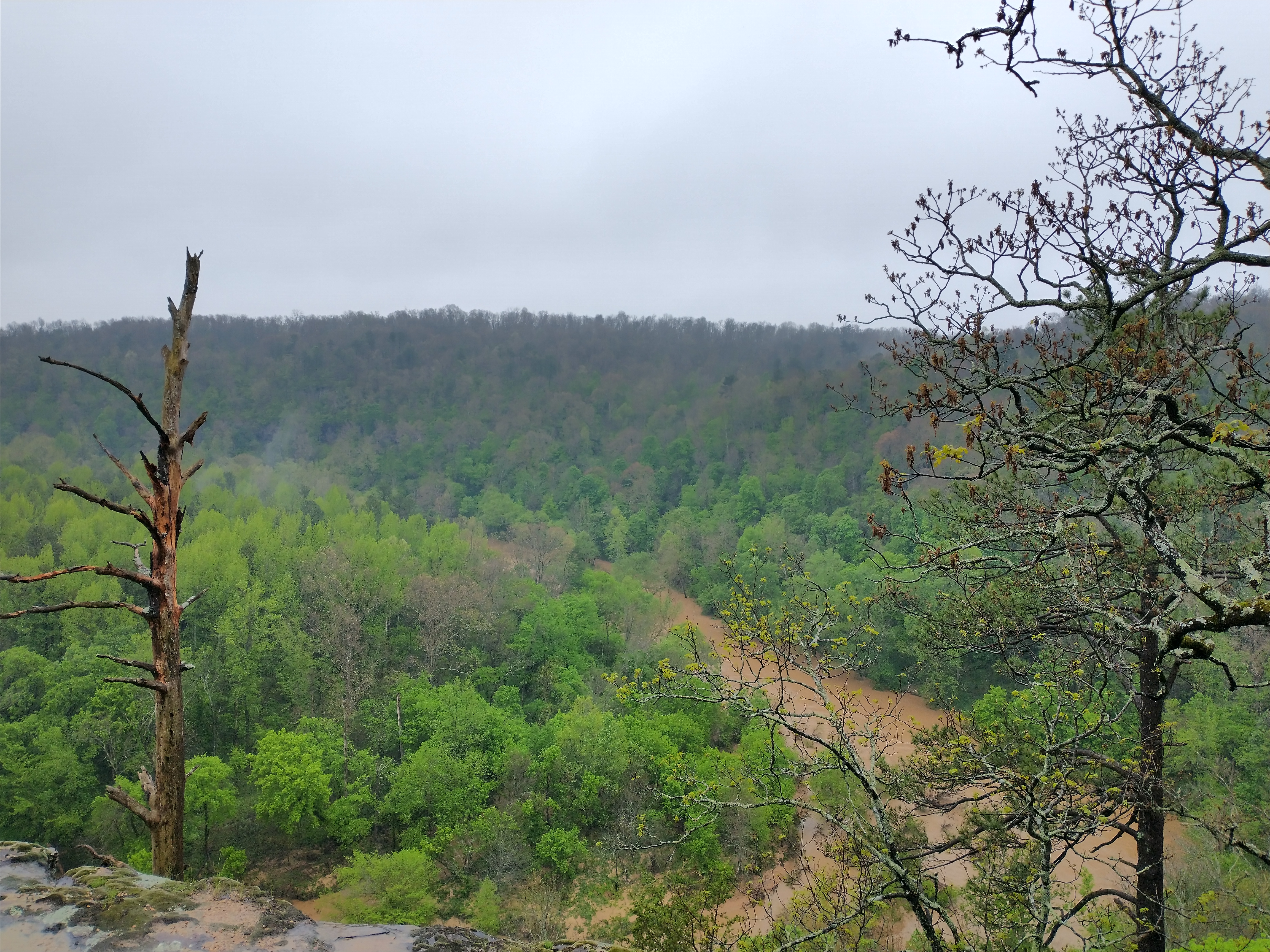 After Fayetteville I just drove on some long unpaved roads until I found stuff to do. I was heading towards Mills Springs Day Use area in what is mostly ATV infested woods when was stopped by a tree in the road. There’d been storms when I was in Fayetteville and there were a lot of downed trees. A couple in an F-250 with a camper shell were taking it apart with a hand axe. I got my full size one out but it was a little dull to their liking. We got the branch off and they were trying to pull it out of the way with their truck when the Forest Service arrived with a chainsaw and made short work of it. The couple was cool, recently retired marines who were 5 months into their cross country road trip. I told them about the water falls hike at Hercules Glen and they showed me a good campsite I stayed for 2 days.