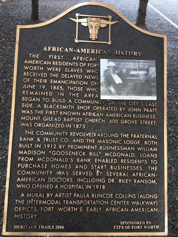 Columbia is doing a lot of documentation and signage around our African American heritage. If Ft. Worth is like Columbia it’s African American history has to be retroactively documented because of a long period of systematic destruction by the white power structure. For us in Columbia it was urban renewal and the siting of Providence Road. The neighborhood and the thriving black business district was destroyed. In Columbia in 1950 5% of businesses were owned by African Americans and now it is a fraction of a percent. I don’t know the Ft Worth story but I bet it’s similar. ![]()